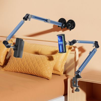 The LS-T01 series mounts are adjustable lazy stands designed for tablets, offering both desktop clamp and double suction cup installation options. Made of premium aluminum alloy, the stand consists of two sections connected by a universal ball joint arm. The lower section can be lengthened or shortened using a side knob and is attached to the desktop clamp (or double suction cup base). The upper section connects to the tablet holder via another universal ball joint arm, compatible with devices ranging from 4 to 12.9 inches.