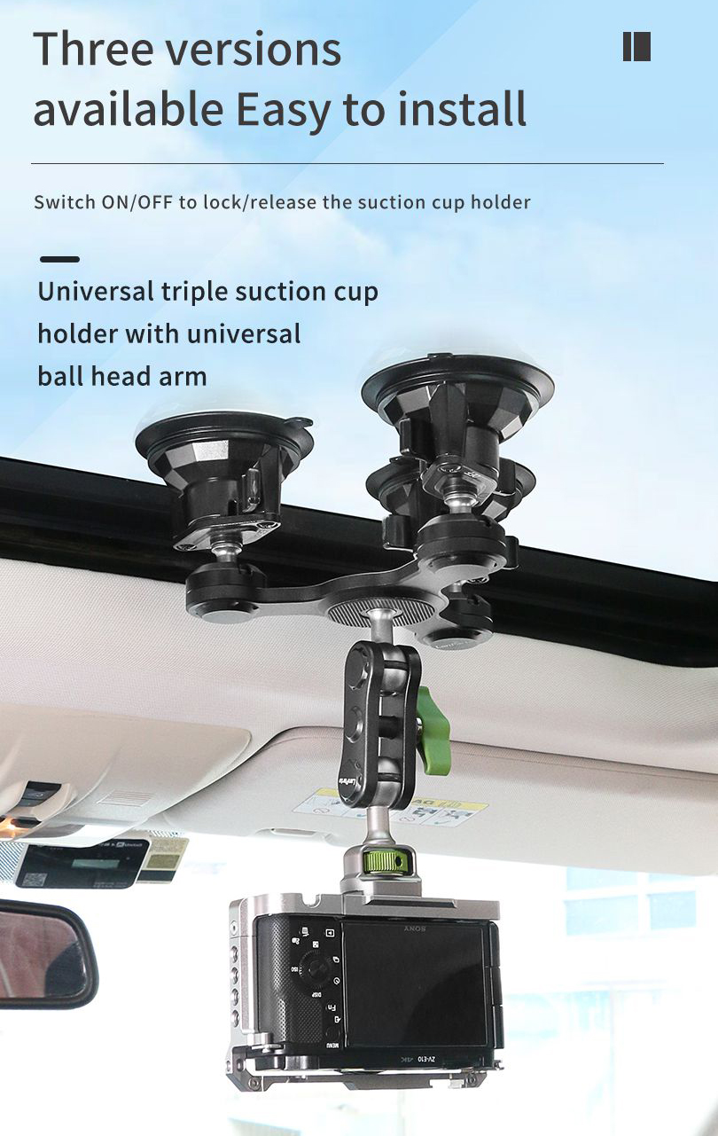 This triple suction cup camera mount, with stronger grip, is a perfect solution for shooting outside of a car. The whole suction cup mount includes a base made up of three 3.3-inch one-key lock suction cups that is Lanperte’s patented design, and a panoramic gimbal ball-head base. With the unique design of a threaded locking, the suction cup has a firm mounting performance while ensuring easy operation. The three-suction-cup base attaches the mount more firmly onto a car exterior surface (sometimes not flat). Made of aluminum alloy, the ball head has a bearing of up to 2kg. The camera quick release plate on the top is coated in rubber and equipped with a 1/4’’-20 thread for easy camera connection and release. The ball-head base has separate control knobs for horizontal, vertical, and side adjustments, with a scale for precise angle adjustments. There is also a built-in bubble level indicator for accurate and panoramic shooting.